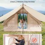 • All-Season Comfort: Equipped with a stove jack and AC port, this luxury camping tent ensures a comfortable environment year-round. 2 doors, 2 windows, and mesh screens keep the air fresh, while the zippers protect against nighttime animal intrusions.